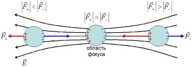 Рисунок 19. Схематическое изображение ТРЁХ шарообразных частиц, находящихся в НЕоднородном электрическом поле фокусированного светового луча вблизи области фокуса. Знаками " +" и " -" показаны связанные заряды, возникшие на поверхности частиц при их поляризации. Электрические силы, действующие на положительные (F+) и отрицательные (F-) связанные заряды, вызывают движение частиц по направлению к области фокуса.