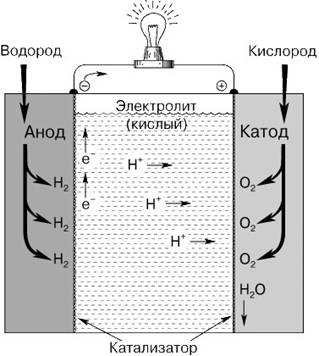 Рисунок 46. Схематическое изображение топливного элемента, состоящего из двух электродов, разделенных электролитом. К аноду подводят водород, который, проникая в электролит через очень мелкие поры в материале электрода и участвуя в реакции хемосорбции, превращается в положительно заряженные ионы. К катоду подводят кислород и удаляют воду, продукт реакции. Для ускорения реакции применяют катализаторы. Электроды топливного элемента соединяют с нагрузкой (лампа).