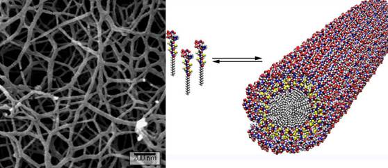 Рисунок 61. Справа – схематическое изображение нановолокна, образующегося из амфифильных молекул, несущих на себе химические структуры, блокирующие рост рубца и активирующие рост нервов (обозначены разными цветами). Слева – микрофотография каркаса, образованного из нановолокон в месте повреждения спинного мозга; калибровка, 200 нм. Взято из Hartgerink et al., Science, 294, 1684 (2001).