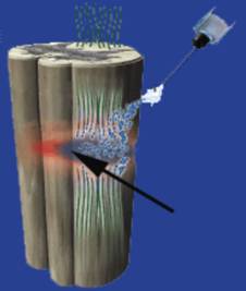 Рисунок 62. Схематическое изображение повреждённого участка спинного мозга (стрелка) и шприца, с помощью которого в этот участок вводят жидкость с амфифильными молекулами. Взято из Silva et al, Science, 303, 1352 (2004).