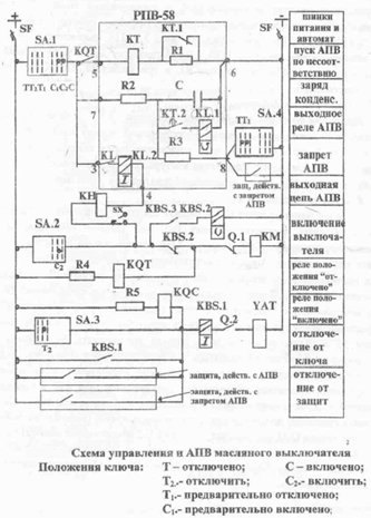 АПВ однократного действия выполняется на основе комплекта РПВ-58. Успешность однократного АПВ составляет 60-70%. АПВ совместно со схемой управления масляным выключателем представлено на рисунке: