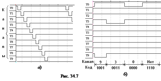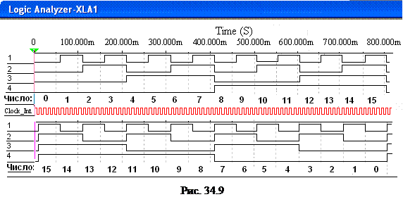 При замкнутом ключе Space число поданных от генератора Е1 на вход счётчика импульсов высвечивается на индикаторе DCD_HEX в десятичном коде, от 0 до 15, после чего счётчик обнуляется и вновь начинается счёт. При этом на одном из выходов дешифратора DC формируется сигнал низкого уровня (логический 0), номер которого соответствует коду входного числа: от 0000 до 1001 (910). При разомкнутом ключе Space сформированное с помощью переключателей на входе счётчика 4-разрядное двоичное число высвечивается на индикаторе в десятичном коде, а на экране анализатора на одном из выходов, соответствующем входному коду счётчика, формируется логический 0. Задание 2. Замкнуть ключ Space, запустить программу моделирования суммирующего счётчика и наблюдать за показаниями индикатора. Убедиться, что на экране анализатора XLA1 логические нули перестают формироваться после прихода 11-го тактового импульса и появляются вновь только с приходом 17-го импульса (рис. 34.7, а). Разомкнуть ключ Space. Установить в диалоговом окне анализатора XLA1 напряжение V = 5 B, частоту таймера fa = 2 кГц, число импульсов, приходящихся на одно деление, Clocks/div = 60. (При таком режиме лучи медленно перемещаются на экране анализатора). С помощью активных клавиш 1, 2, 3 и 4 клавиатуры сформировать произвольные (или по указанию преподавателя) двоичные входные числа (коды), например 1001, 0011, 0000, 1110 и подавать их на входы D, С, В и А счётчика. Убедиться, что