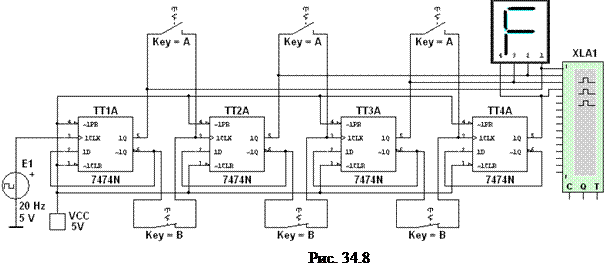 К входам А, В, С и D счётчика СТ подключен источник постоянного напряжения VCC, переключатели 1, …, 4 для формирования входных двоичных кодов и ключ Space для изменения режима работы счётчика. В синхронном счётчике заданные с помощью ключей уровни сигналов подаются на входы всех триггеров, как и тактовые импульсы, которые подаются на счётные входы всех разрядов счётчика.