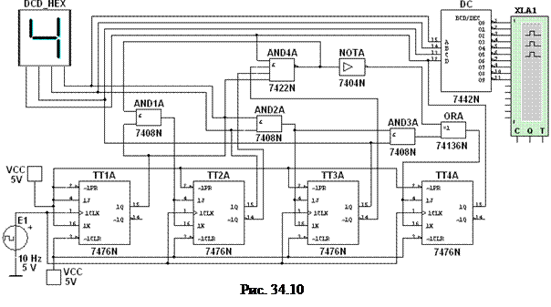 Установить в диалоговом окне анализатора XLA1 напряжение V = = 5 B, частоту таймера fa = 2 кГц, число импульсов, приходящихся на одно деление, Clocks/div = 60. Разомкнуть ключи В и замкнуть ключиА. З апустить программу моделирования счётчика. При высвечивании числа 15 на 7-сегментном индикаторе щёлкнуть мышью на кнопке Stop (остановки моделирования) и скопировать окно анализатора с результатами моделирования на страницу отчёта (см. верхнюю часть рис. 34.9). Разомкнуть ключи А и замкнуть ключи В. Щёлкнуть мышью на кнопке Stop (продолжить моделирование), остановить моделирование при высвечивании числа 0 на индикаторе и скопировать окно анализатора с результатами моделирования в отчет (см. нижнюю часть рис. 34.9). Задание 4. Открыть файл 34.10.ms10, размещённый в папке Circuit Design Suite 10.0 среды МS10, или собрать на рабочем поле среды MS10 схему для испытания десятичного счётчика (рис. 34.10) и установить в диалоговых окнах компонентов их параметры или режимы работы. Скопировать схему (рис. 34.10) на страницу отчёта. Результаты моделирования 4-разрядного двоичного счетчика (см. рис. 34.8 и рис. 34.9) показали, что с его помощью можно сосчитать до 15. Следовательно, для создания счётчика натуральных десятичных чисел в двоичном коде для одной декады нужно в схему двоичного 4-разрядного счётчика ввести обратные связи с логическими элементами, посредством которых сигнал с какого-то старшего разряда поступает в младшие и т. п., обеспечивая в целом выработку счётчиком двоичного эквивалента счётной декады. В функциональной схеме десятичного счётчика (34.10), собранной на триггерах JK -типа, на каждый одиннадцатый тактовый импульс результат счёта сбрасывается в нуль и далее результат счёта увеличивается. Возврат счётчика при поступлении одиннадцатого тактового импульса в начальное состояние обеспечивается дополнительной комбинационной схемой с встроенными логическими элементами И (AND), ИЛИ (OR) и НЕ (NOT).