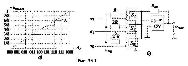 Итак, цифроаналоговый преобразователь предназначен для прямого преобразования входного двоичного кода, например, Аi (а 2 а 1 а 0) в аналоговый эквивалент. Выходная аналоговая величина, обычно напряжение uвых, иногда нормированное uвых.н = uвых / uвых.max, соответствует кодовой комбинации Аi, поступившей на вход, и воспроизводится для дискретных моментов времени (рис. 35.1, а). Сменяющиеся входные цифровые коды обуславливают сменяющееся ступенчатое напряжение на выходе (L - идеальная передаточная характеристика ЦАП). Существует два широко распространенных способа цифроаналогового преобразования с использованием: · резистивной матрицы с весовыми двоично-взвешенными сопротивлениями; · резистивной матрицы с двумя номиналами сопротивлений, которую обычно называют матрицей R –2 R. ЦАП с весовыми двоично-взвешенными сопротивлениями (рис. 35.1, б) состоит: из п переключателей Si (по одному на каждый разряд), управляемых двоичным кодом Аi; из матрицы двоично-взвешенных резисторов с сопротивлениями 2 п- 1 R; источника опорного напряжения u 0 и выходного операционного усилителя ОУ, с помощью которого суммируются токи, протекающие через резисторы с двоично-взвешенными сопротивлениями, для получения аналогового выходного напряжения uвых. Каждый i -й разряд управляет переключателем Si, который подключается к источнику опорного напряжения u 0, когда аi = 1, или к общей шине, когда аi = 0. Сопротивления резисторов 2 n- 1 R (п – номер разряда входного кода), соединенных с ключами, таковы, что обеспечивают пропорциональность в них тока двоичному весу соответствующего разряда входного кода. Следовательно, ток на входе ОУ и выходное напряжение ЦАП: