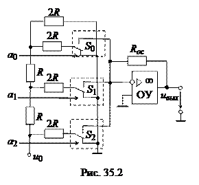 Во второй схеме ЦАП с матрицей R-2R используют резисторы с двумя номиналами сопротивлений, причём резисторы с сопротивлением R включены в каждый разряд (см. рис. 35.2 при п = 3). Однако в этой схеме увеличиваются значения паразитных ёмкостей. Принцип функционирования схемы основан на свойстве резистивного делителя R- 2 R сохранять постоянное сопротивление нагрузки для источника опорного напряжения при замыкании ключей. Вследствие этого на выводах резистора R, начиная со старшего п - 1 разряда, опорное напряжение последовательно делится пополам, как и входящий в каждый узел матрицы ток. При этом напряжение на выходе преобразователя с матрицей R –2 R: