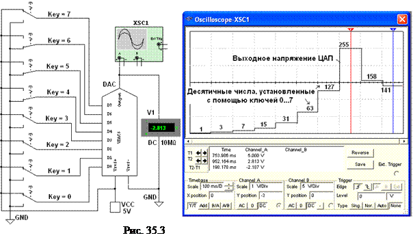 Задание 1. Запустить лабораторный комплекс Labworks и среду МS10 (щёлкнув мышью на команде Эксперимент меню комплекса Labworks). Открыть файл 35.3.ms10, размещённый в папке Circuit Design Suite 10.0 среды МS10, или собрать на рабочем поле среды MS10 схему для испытания интегрального цифроаналогового преобразователя (рис. 35.3, а) и установить в диалоговых окнах компонентов их параметры или режимы работы. Скопировать схему (рис. 35.3, а) на страницу отчёта. В схеме (рис. 35.3, а) использован библиотечный (Mixed) 8-разрядный цифроаналоговый преобразователь DAC, на входы которого подаются сформированные с помощью переключателей 0, …, 7 двоичные коды от 00000000 до 111111112 (FF16 или 25510). Выходное напряжение ЦАП можно измерить с помощью вольтметра V1 или осциллографа XSC1, воспользовавшисьвизирными линиями, расположенными на его экране. Задание 2. Получить на экране осциллографа XSC1 ступенчатое выходное напряжение ЦАП (рис. 35.3, б). Для этого нужно вначале замкнуть переключатель 0, т. е. подать напряжение 5 В на вход D0 ЦАП, и запустить программу моделирования. На выходе ЦАП формируется напряжение, равное ЗМР. Затем во время остановок моделирования замыкать поочерёдно переключатели 1, 2, …, 7, подавая входные десятичные ком Повторить эксперимент, подавая на входы ЦАП сформированные с помощью переключателей шестнадцатеричные коды от 0 до FF (25510) через шаг 1016 (1610) и занося в табл. 35.1 показания вольтметра V1 (значения выходного напряжения uвых ЦАП) при напряжении источника VCC uo = 5 В. Найти частичные и усредненное значение ступени, частичные и усреднённое значение МЗР. Построить график uвых (N), выбрав соответствующие масштабы для напряжений и входных десятичных чисел N, откладываемых по осям координат. Т а б л и ц а 35.1