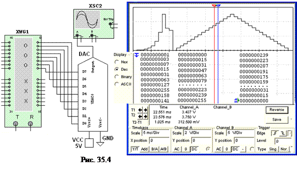 Задание 3. Открыть файл 35.4.ms10, размещённый в папке Circuit Design Suite 10.0 среды МS10, или собрать на рабочем поле среды MS10 схему для испытания цифроаналогового преобразователя (рис. 35.4, а) и установить в диалоговых окнах компонентов их параметры или режимы работы. Скопировать схему (рис. 35.4, а) на страницу отчёта. Провести моделирование ЦАП, запрограммировав генератор XWG1 (частота генерации сигналов fг = 1 кГц) на возрастание и убывание шестнадцатеричных чисел от 0 до FF (25510) при шаге 1016 (1610). Составить таблицу и занести в неё выходные напряжения ЦАПи величину ступеней, которые выводятся в нижнем окне осциллографа XSC2. Измерение напряжений проводить с помощью визирных линий осциллографа, устанавливая их на двух соседних ступенях (см. рис. 35.4, б) при различных кодовых комбинациях на выходе генератора XWG1 и напряжении uo = 5 В источника VCC. Так, при входных десятичных числах 175 и 191 и напряжении uo = 5 В выходные напряжения ЦАП соответственно равны 3, 437 В и 3, 750 В, а напряжение ступени -312, 5 мВ. При этом ЗМР = 312, 5/16 = 19, 53 B. Найти Установить напряжение uo = 10 В источника VCC и повторить моделирование ЦАП при опорном напряжении 10 В. Построить графики uвых (N) при uo = 5 Ви uo = 10 В на одном рисунке, выбрав соответствующие масштабы для напряжений и входных десятичных чисел N, откладываемых по осям координат. СОДЕРЖАНИЕ ОТЧЁТА 1. Наименование и цель работы. 2. Перечень приборов, использованных в экспериментах, с их краткими характеристиками. 3. Изображения электрических схем для испытания цифроаналогового преобразователя. 4. Копии графиков выходного напряжения исследуемого ЦАП, отображающих его работу. 5. Графики uвых (N) при различных значениях опорного напряжения. 6. Выводы по работе.
