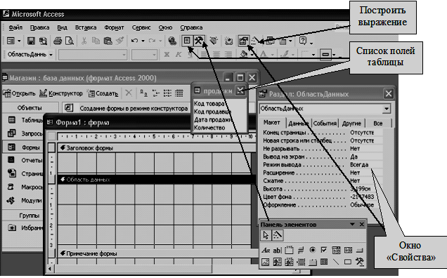 1) открыть окно базы данных (F11); 2) в окне открыть вкладку «Формы»; 3) нажать кнопку Создать; 4) в диалоге «Новая форма» выбрать способ создания формы, список их приведён на рис. 17. Рис.17. Диалоговое окно «Новая форма» 5) указать (или выбрать из списка) имя таблицы, для которой создаётся форма. Создание простейших форм – Автоформа было рассмотрено в [1]. Здесь объясняются другие способы создания форм. При помощи Мастера форм можно создавать формы с выбранными полями и заданного стиля оформления в несколько этапов: a) в окне диалога «Создание форм» выбрать поля из списка доступных полей исходной таблицы (таблицу или запрос можно указать и здесь), кнопка Далее, b) в следующем окне выбрать внешний вид формы: в один столбец, ленточный или табличный, Далее; c) далее выбрать в списке стиль оформления создаваемой формы, Далее; d) в последнем окне - ввести заголовок формы, Мастер сохранит форму под этим именем, - выбрать режим Открыть форму для просмотра и ввода данных; - Готово. Наиболее разнообразные и совершенные формы создаются инструментами Конструктора форм. G Примечание. Режим работы Конструктора или Мастера форм можно выбрать на вкладке Формы окна базы данных. При открытии окно Конструктора формы содержит одну область – область данных. Она может быть расширена (или сужена) за счёт изменения нижней границы. Область данных служит для размещения основных элементов управления[3]. Кроме области данных форма может содержать область заголовка, примечания и нижний и верхний колонтитулы. Для добавления этих областей используются команды Вид Заголовок/примечание формы и Вид Колонтитулы (можно их найти и в контекстном меню области данных). G Примечания. 1. Данные, размещённые в заголовке, в области данных и в области примечания, отображаются в форме. 2. Области верхнего и нижнего колонтитула выводятся только при печати. Самые необходимые инструменты для создания форм лучше иметь в окне Конструктора раскрытыми – Панель элементов, Список полей, Свойства (они вызываются с помощью соответствующих кнопок панели инструментов – рис.18). Панель элементов – своеобразный «командный центр» создания формы. Она содержит кнопки для всех элементов управления, которые можно использовать при создании формы. Любой элемент управления можно перетащить в форму в указанное место по известной технологии “drag and drop”. Описание элементов управления и их назначение см. в приложении 1. Список полей таблицы для создаваемой формы помогает легко помещать поля в нужное место формы перетаскиванием нажатой левой кнопкой мыши. При создании поля в форме Access присоединяет к нему надпись, содержание которой соответствует имени поля в исходной таблице (имя поля в надписи можно изменить непосредственно в элементе Надпись или в поле Подпись окна свойств). Надпись располагается левее самого поля. Это нужно учитывать при перетаскивании – лучше размещать поле на расстоянии 3 см от левого края области данных. Можно одновременно перетащить несколько полей (выделить с помощью клавиши Ctrl) или все поля (выделить всё – дважды щелкнуть по заголовку окна Список полей). Свойства. Форма, каждый её раздел (заголовок, область данных, раздел примечаний) и элементы управления имеют свойства, которые устанавливаются с помощью окна свойств. Набор свойств, представленных в этом окне, зависит от выделенного 