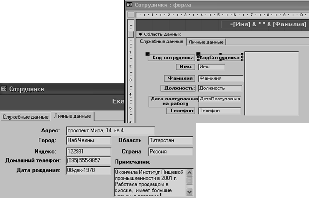 Рис.19. Пример формы для базы данных «Магазин» (в режиме Конструктора и в рабочем состоянии).