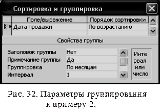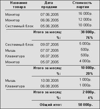 Рис.33. Результат выполнения примера 2. Пример 3. Создать отчёт, содержащий только итоги продаж каждого товара. Выполнение: 1. Создать запрос, содержащий необходимые поля для подведения итогов; 2. Задать группирование по выбранному полю, для заголовка группы указать параметр «Нет», а для примечания группы – «Да»; 3. Оформить верхний колонтитул страницы: заголовок отчёта, вставить дату и подписи полей; 4. Значения полей установить в Примечании группы, задать выражения с итоговыми функциями; 5. Оформить Примечание всего отчёта – подсчитать общие итоги по всему отчёту, параметры ответственного за отчёт.