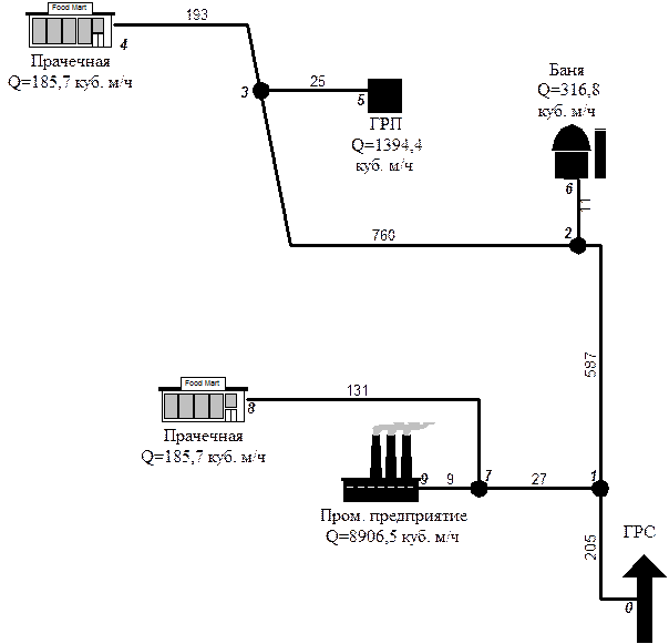 Таким образом, двигаясь в процессе расчета от узла к узлу по ходу движения газа, необходимо запроектировать такие диаметры участков, чтобы у каждого потребителя (ГРП, ГРУ котельных и предприятий) обеспечивалось необходимое давление. Указанная характеристика у каждого потребителя может быть своя и, естественно, должна быть изначально задана, равно как и давление у источника газоснабжения (ГРС или существующий газопровод). Отмеченные положения можно формально выразить следующим образом: Пример 4. Произвести гидравлический расчет тупиковой сети высокого давления (рис.), если после ГРС давление составляет 0, 6 МПа, а у каждого отдельного потребителя 0, 3 МПа. Результаты расчета представлены в таблице 10. Таблица 10