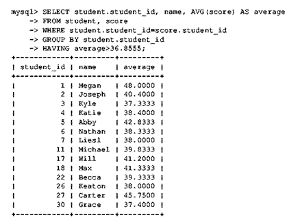 Параметр HAVING. Цей параметр встановлює, які записи, що згруповані за допомогою параметра GROUP BY, повинні бути на екрані. Після об'єднання записів за допомогою параметра GROUP BY і застосування параметра HAVING вибираютьсязаписи, які відповідають умовам, що задані в параметрі HAVING. Це є додатковою можливістю фільтрації даних. Параметр HAVING є не обов'язковим, він повинен знаходитися після параметру GROUP BY. У параметра HAVING ті ж функції, що у параметра WHERE. Різниця WHERE і HAVING полягає в тому, що перше використовується до групування, а друге — після. Вибрати студентів, що мають середній бал вище середнього бала, по всій таблиці score. Спочатку знайдемо загальний середній бал:
