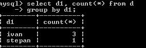 Команди COUNT() і GROUP BY допомагають характеризувати дані різними способами. Наступний запит підраховує кількість різних імен в полі d1. Формат команди для підрахунку згрупованих даних: SELECT ім’я поля, по якому групуються дані [інші поля], COUNT(*) FROM список таблиць, з яких вибираються дані WHERE умова, яку мають задовольняти записи, що вибираються GROUP BY ім’я поля, по якому групуються дані