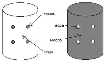 Рис. 5. Схема действия гидрофильных и гидрофобных эмульгаторов