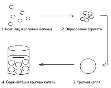 Рис. 4. Схема нарушения агрегативной устойчивости эмульсий.