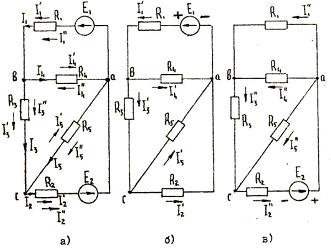 Изобразим основную (рис. 2.4, а) и дополнительные схемы (см.рис. 2.4, б, в), в последних оставляем по одной эдс, а вторую эдс закорачиваем. На рис. 2.4, б, в обозначим положительные направления токов в ветвях.