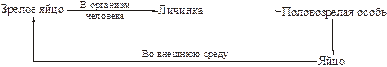 Продолжительность жизни – около 5 лет. Инвазионная форма: зрелое яйцо. Способ заражения: per os. Путь заражения: алиментарный (через грязные руки, загрязненную пищу и воду). Патогенные формы: личинка; половозрелая особь. Локализация: 1. личинка