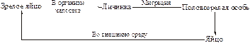 Геогельминт. Яйца развиваются во внешней среде в течение 3-4 недель при оптимальной температуре 20-25°С. Зрелое яйцо содержит личинку. Миграция личинки в организме человека объясняется тем, что личинка в процессе развития нуждается в кислороде. Продолжительность жизни – около 1 года. Инвазионная форма: зрелое яйцо. Способ заражения: per os. Путь заражения: алиментарный (через грязные руки, загрязненную воду и пищу). Патогенные формы: личинка; половозрелая особь. Локализация: 3. Личинка совершает миграцию в организме: