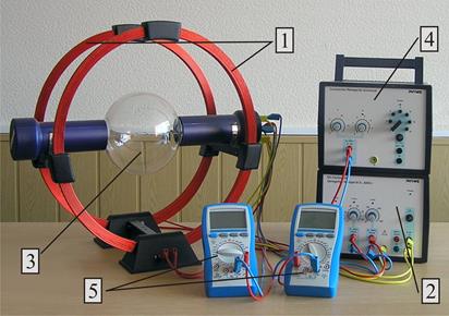 Для определения удельного заряда электрона используется экспериментальная установка, показанная на рис.1. В нее входят: пара катушек Гельмгольца 1, специальная электронно-лучевая трубка 3, источник питания 2 электронно-лучевой трубки с регулируемыми напряжениями 0 – 600 В и 0 – 50 В, источник для питания катушек 4 с регулируемым напряжением 0 – 18 В, мультиметры 5, соединительные провода.