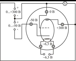 Рис.3. Схема подключения электронно-лучевой трубки к источникам питания. Катушки Гельмгольца (кольца Гельмгольца), создающие магнитное поле внутри электронно-лучевой трубки, представляют собой две одинаковые катушки. Они расположены в параллельных плоскостях так, что их центры находятся на общей оси (рис.4). Катушки соединены последовательно и подключены к источнику питания (рис.1, поз.4).