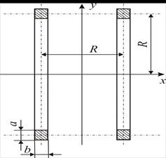 Рис.4. Кольца Гельмгольца. Назначение катушек Гельмгольца, несмотря на простоту конструкции, – создание с одной стороны высокооднородного магнитного поля в пределах большого объема пространства, а с другой стороны – обеспечение свободного доступа к этому пространству. Наибольший относительный объем высокооднородного поля получается, если расстояние между срединными плоскостями катушек l равно их среднему радиусу R. Тогда компоненты создаваемого магнитного поля в системе координат (x, y), показанной на рис.4, будут определяться следующими приближенными формулами: