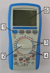 Рис.5. Передняя панель мультиметра. 1 – кнопка включения; 2 – переключатель рода работ; 3 – шкала пределов измерения