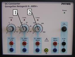 Рис.7. Вид передней панели источника питания катушек Гельмгольца. 1 – ручка регулирования напряжения; 2 – ручка регулирования ограничения тока. Включите мультиметры (рис.1, поз.5), кнопками, расположенными на их передних панелях (рис.5, поз.1). На мультиметре, подсоединенном к источнику питания электронно-лучевой трубки, переключатель рода работ (рис.5, поз.2) установите в положение 1000 В, а на мультиметре, измеряющем силу тока в катушках Гельмгольца, переключатель рода работ которого поставьте в положение 20 А. Если величина тока, протекающего в катушках Гельмгольца равна нулю, то магнитное поле внутри электронно-лучевой трубки отсутствует. При этом в ней формируется вертикальный электронный луч, который при прохождении в аргоне оставляет след, видимый в затемненном помещении. Постепенно увеличивая ток в катушках Гельмгольца вращением регулятора напряжения источника (рис.7, поз.1), можно наблюдать искривление луча с последовательным попаданием его на шкалу, по которой фиксируются диаметры траектории, соответственно от 10 см до 4 см. Для каждой такой траектории с помощью мультиметра измерьте силу тока в катушках Гельмгольца. Величина напряжения U на электронно-лучевой трубке определяется показаниями второго мультиметра. Компонента Результаты измерений и расчетов внесите в таблицу. Таблица