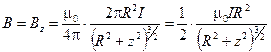 Рис.8. К выводу формулы для магнитного поля на оси кругового тока. Применим полученный результат к кольцам Гельмгольца, изображённым на Рис.9. В точке, равноудаленной от колец, их вклады в магнитное поле равны по модулю и по направлению, поэтому магнитную индукцию (6) необходимо удвоить. Подставляя