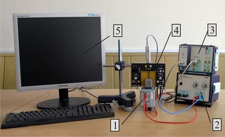 Экспериментальная установка собрана и подсоединена к компьютеру. С помощью компьютера задаются необходимые параметры для проведения измерений, накапливаются экспериментальные данные и проводится их обработка. Внешний вид установки представлен на рис.2. На рис.3 представлен внешний вид измерительной ячейки с электромагнитом. На рис.4 представлен внешний вид блока питания, на передней панели которого находятся ручки регулировки напряжения и тока (рис.4, поз.1, поз.2), подаваемых на электромагнит (рис.3, поз.3).
