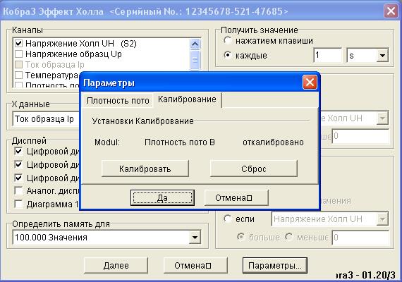 1. Включите компьютер. Зайдите в систему под учетной записью «Student». 2. Включите установку, нажав тумблер «Сеть» на задней панели блока питания. Откройте программу «Measure». В контекстном меню «Прибор» выберите пункт «Кобра 3 “Эффект Холла”». Появится окно параметров измерения эффекта Холла (рис.5). Установите параметры в соответствии с рисунком: · В разделе «Каналы» выберите (поставьте галочку) «Напряжение Холла UH». · В поле со списком «Х -данные» выбираем «Ток образца Ip». · В разделе «Дисплей» выберите (поставьте галочку) «Цифровые дисплеи 1-5». · Задайте объем памяти в 100000 точек, для этого в поле со списком «Определить память для» выберите «100.000 Значения» · В разделе «Получить значения» введите «каждые 1 s» · В разделах «Начало измерения» и «Конец измерения» выберите «Нажатием клавиши». 3. Для калибровки модуля «Тесла» нажмите кнопку «Параметры». Появится окно калибровки (рис.6). Во вкладке «Плотность потока» «Диапазон оси Y» выберите 4. В окне параметров измерения эффекта Холла нажмите «Далее». Появится пять окон фиксируемых параметров (рис.7): «напряжение Холла UH», «напряжение на образце Uр», «ток образца Ip», «температура образца Tp», и «плотность потока B» (из-за неверного перевода под плотностью потока в программе Measure подразумевается магнитная индукция B).