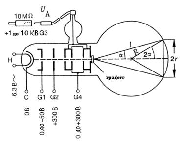Рис.6. Схема подключения электронно-лучевой трубки. Возникновение дифракционной картины при рассеянии электронов на поликристаллах графита подтверждает наличие у них волновых свойств. Диаметр дифракционного кольца зависит от ускоряющего напряжения, определяющего длину волны электронов. Учитывая, что угол скольжения