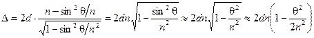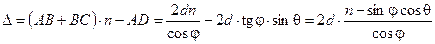 Рис. 11 – Разность хода лучей в интерферометре Фабри-Перо. Обозначим: n – показатель преломления среды между ограничивающими поверхностями, а θ и φ – углы между соответственно падающим и преломленным лучом и нормалью к этим поверхностям. Тогда разность хода между парой последовательных когерентных волн (см.рис. 11):