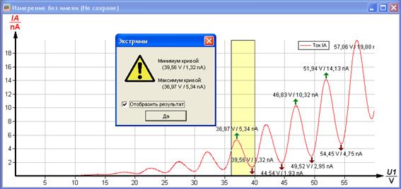 Рис.9. Окна с измерениями. При нажатии кнопки «Начать измерения» начнется автоматическое снятие вольт-амперной характеристики (ВАХ). Если в процессе измерения появляется окно с ошибкой «Трубка зажжена», то установленные значения «Напряжения U 2» и «Т акт температуры» были выбраны неверно, и их необходимо изменить. Для этого нажмите в окне ошибки кнопку «Да», появится график ВАХ для заданной температуры и напряжения U 2, закройте его и вернитесь к пункту 4. 7. По окончании измерений выводится график ВАХ для «Напряжения U 2» и «Т акт температуры». Для определения необходимых параметров ВАХ (напряжений, соответствующих максимумам и минимумам) следует воспользоваться программным инструментом «Выделить»