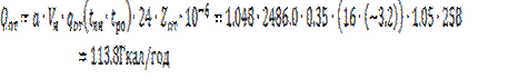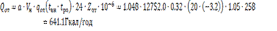 Где: A 1.048-поправочный коэффицент. Vн –наружный строительный объём здания (м3) qот – удельная отопительная характеристика здания (ккал/м3∙ ч∙ 0С) tвн – усреднённая расчётная температура воздуха внутри помещения (0С) tро – расчётная температура наружного воздуха для отопления здания (0С) kтп – повышенный коэффициент для учёта потерь теплоты теплопроводами. Zот – продолжительность работы систем отопления за рассматриваемый период (сут.) Железнодорожная больница