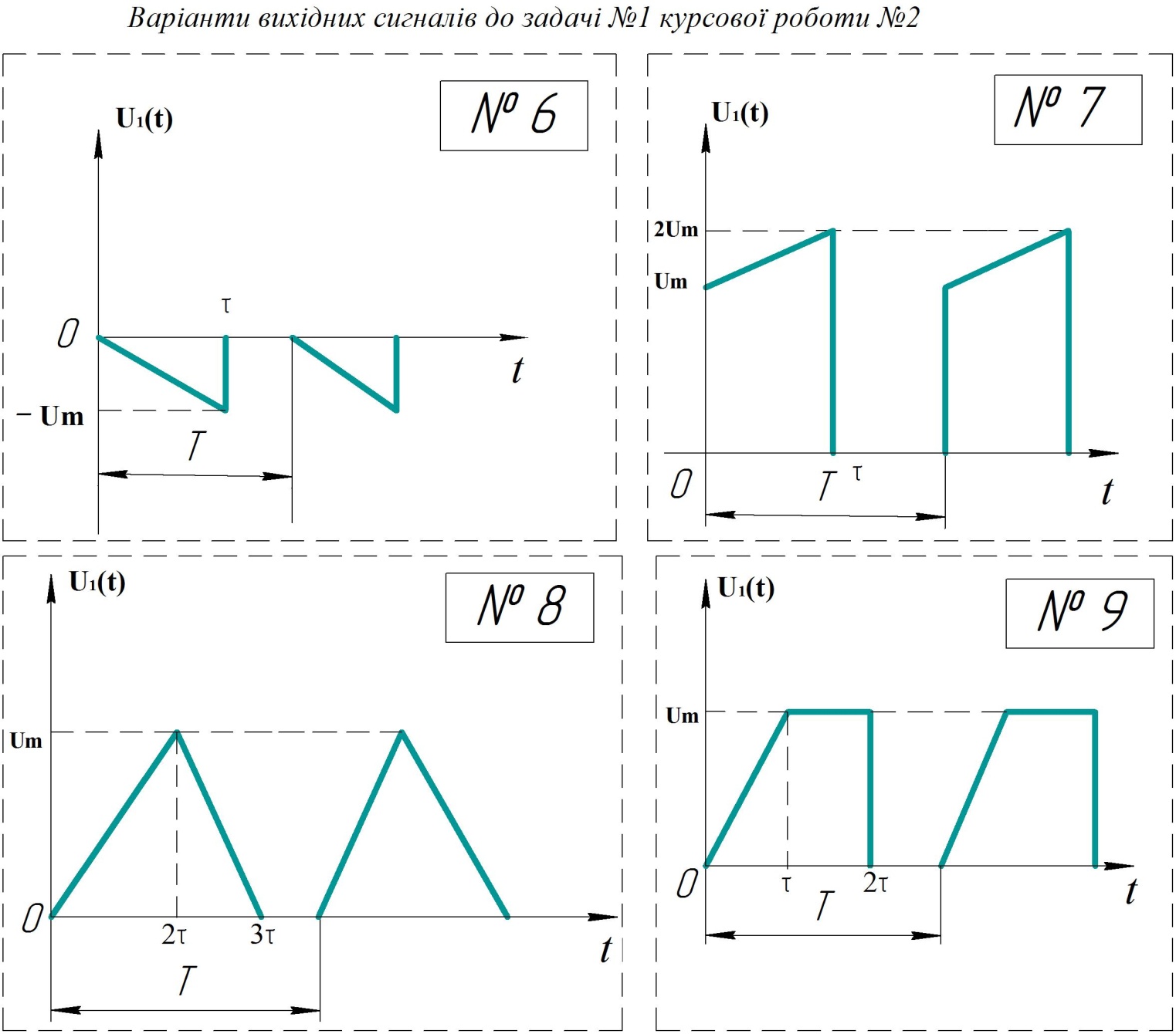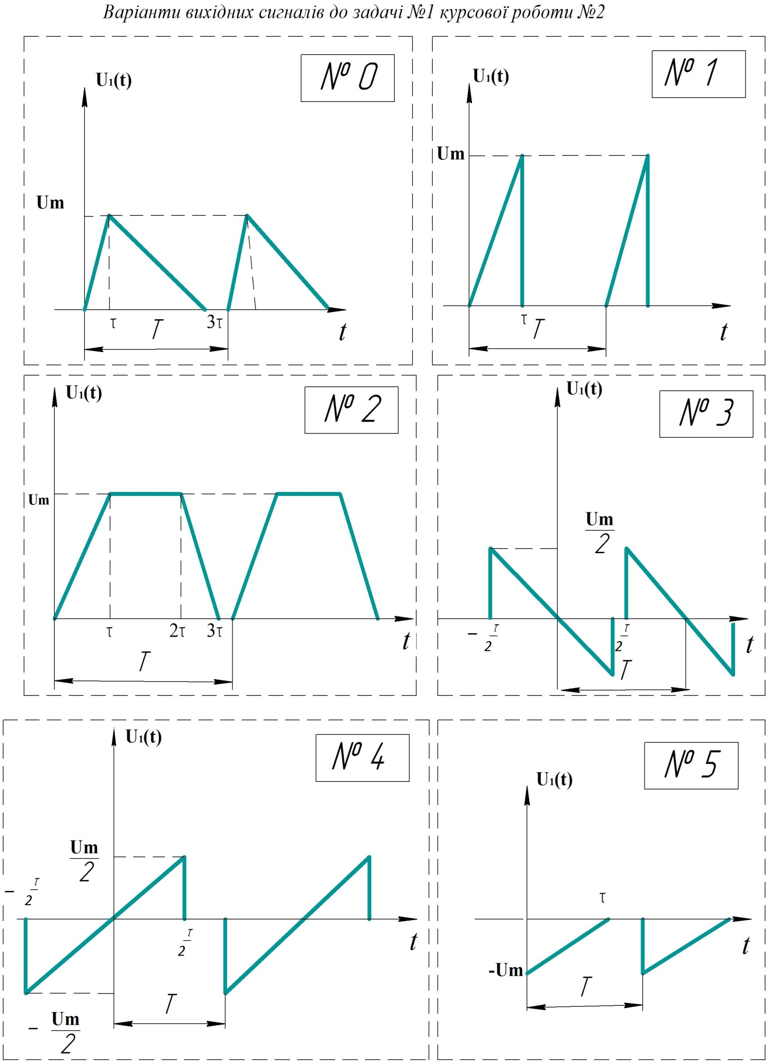 По заданій схемі визначити комплексну передавальну функцію ланцюгаK(jω). Визначити АЧХ і ФЧХ ланцюга (K (ω), φ (ω),). Визначити комплексні коефіцієнти передачі ланцюга для перших шести гармонік k (nΩ) = k(nΩ)ejψ (nΩ ). Побудувати графічно АЧХ і ФЧХ заданого ланцюга. Визначити смугу пропускання заданого ланцюга – Δ Ω. Обчислити амплітуди дійсного ряду Фур’є вихідного сигналу Umn2. Записати розкладання в ряд Фур’є вихідного сигналу U2(t), обмежившись 6-ма гармоніками. Побудувати АЧС і ФЧС вихідного сигналу. Побудувати часову залежність вихідного сигналу U2(t) та порівняти його з вихідними та оцінити ступінь спотворення сигналу.