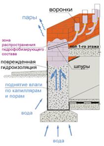 Гидрофобизирующий раствор подается в шпуры самотеком через воронки. Для гидрофобизации стены толщиной 50 см и более пропитка проводится с двух сторон, либо сокращаются интервалы между скважинами.