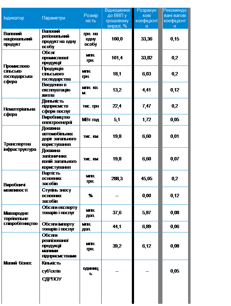1. Виробничо-економічні — відображають узагальнені техніко-економічні результати і тенденції функціонування господарського комплексу регіону, виявляють потенційні загрози в його галузях. 2. Структурні — відбивають структуру господарського комплексу, яка склалася в цілому та промисловості зокрема, що дозволяє оцінити спеціалізацію регіону, раціональність структури на макрорівні з позицій сталості економіки. Ці індикатори вказують на відхилення в макропропорціях господарського комплексу території. 3. Інвестиційні — відображають рівень інвестиційної активності в регіоні, що дає уяву про інтенсивність ділової та виробничої діяльності. 4. Фінансові — характеризують бюджетну забезпеченість населення, дебіторську та кредиторську заборгованість на одного працюючого, кількість сплачених податків у регіоні, тобто відбивають фінансову самостійність та сталість території. 5. Науково-технічного потенціалу — характеризують рівень сприйнятливості сфери виробництва до досягнень науково-технічного прогресу, тенденції розвитку науково-технічного потенціалу, без якого неможливі прогрес та подальше функціонування економіки, а також інформують про загрозу відставання рівня розвитку виробництва від світових досягнень. 6. Зовнішньоекономічної діяльності — свідчать про рівень конкурентоспроможності продукції галузей господарського комплексу, характеризують раціональність структури експорту та імпорту, ефективність зовнішньоекономічних зв’язків.