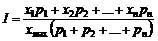 , де х 1, х 2, х 3,..., хn — варіанти; р 1, р 2, р 3,..., рn — частоти варіантів; S хр — сума добутків варіантів, помножених на їхню частоту; S р — сума частот. Середні зважені величини використовують як різні індекси, що дають змогу класифікувати, вимірювати й порівнювати соціальні характеристики. Індекс І розраховують як суму добутків кожного значення ознаки та її частки, поділену на добуток максимального значення ознаки і суми часток.