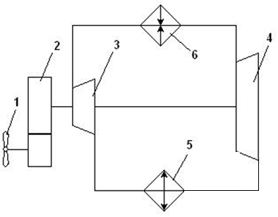 Судно «Капитан Смирнов» имеет два главных газотурбинных агрегата М-25, работающих каждый на ВФШ, их суммарная мощность обеспечивает судну скорость около 27 узлов. Агрегат М-25 имеет мощность 18400кВт при частоте вращения 130 об/мин на выходном валу. Отношение мощности паровой турбины к мощности ГТД Применение ТУК повышает КПД установки и уменьшает удельный расход топлива Дальнейшее развитие ГТД связывают с освоением более высоких температур рабочего тела, для чего требуется создание более жаропрочных материалов, что решается в настоящее время введением в конструкцию турбины элементов металлокерамики. В ГТУ закрытого цикла (рис.6.) в рабочем процессе участвует одно рабочее тело, совершающее кругооборот в изолированном от атмосферы замкнутом тракте. Рабочее тело воздух или какой либо инертный газ сжимается в компрессоре 4 и направляется через нагреватель 6, который повышает его температуру при постоянном давлении до 650-750 С, в турбину 3. Здесь рабочее тело расширяется до давления, близкого к давлению перед компрессором. Далее оно охлаждается забортной водой в охладителе 5 до начальной температуры цикла. Мощность турбины расходуется на привод компрессора и через редуктор 2 используется для привода гребного винта 1. В качестве нагревателя в обычных ГТУ применяют воздушный котел, работающий на органическом топливе, в ядерных ГТУ - ядерный реактор.