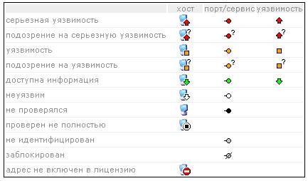 Общее правило простое — если много " красного" - это плохо, много желтого — уже не так плохо, много зеленого - практически нормально. Но лучше всего, если цветных значков вообще нет — это означает полное отсутствие всяких возможностей собрать информацию о хосте, который выглядит со стороны, как " черный ящик". Вот полный перечень значков, используемых XSpider (в начале каждого отчета также приводится подобная расшифровка):