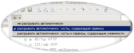 Выбирая в дереве сканирования тот или иной узел (хост, порт, уязвимость), вы получаете в правой половине окна всю доступную по данному пункту информацию. Наиболее существенна информация по уязвимостям — ради этого собственно и выполняется весь процесс. Данные по хостам и сервисам предоставляют дополнительную информацию (версии и т.п.), которая также может быть важна. " Ветви" дерева сканирования можно " сворачивать" и " раскрывать". Имеется в виду настройка всего дерева сразу. По умолчанию (сразу после запуска) XSpider работает в режиме, когда он автоматически раскрывает узлы хостов, для которых найдены сервисы. Таким образом, вы сразу можете видеть все обнаруженные сервисы, но не уязвимости. Если вы считаете, что это жутко неудобно и оскорбляет ваше человеческое достоинство, то можете легко изменить положение вещей. Слева над деревом сканирования находится кнопка, раскрывающая меню режимов отображения дерева сканирования: