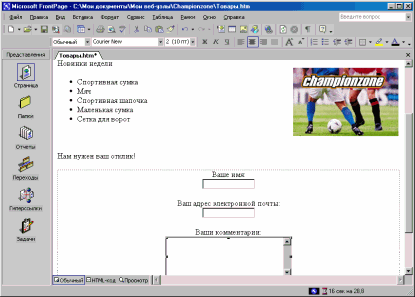 1. Нажмите кнопку Отправить, а затем — кнопку По центру 2. Нажмите клавишу < Стрелка влево>, чтобы поместить курсор перед кнопкой Отправить и нажмите клавишу ENTER. 3. Щелкните поле и нажмите клавишу < Стрелка влево>, чтобы поместить курсор в начало формы. 4. В первой строке введите фразу Ваше имя: и нажмите клавиши SHIFT+ENTER. 5. Поместите курсор после поля и нажмите клавишу ENTER. 6. На следующей строке наберите фразу Ваш адрес электронной почты: и нажмите клавиши SHIFT+ENTER. 7. В меню Вставка выберите пункт Форма, еще раз выберите Поле и нажмите клавишу ENTER. 8. В следующей строке введите фразу Ваши комментарии: и нажмите клавиши SHIFT+ENTER. 9. В меню Вставка выберите пункт Форма, а затем — пункт Текстовое поле. 10. Дважды щелкните только что вставленное текстовое поле. 11. В диалоговом окне Свойства текстового поля измените параметры Ширина в знаках и Число строк, задав для них значения 30 и 5 соответственно, а затем нажмите кнопку ОК. 12. На панели инструментов нажмите кнопку Сохранить для сохранения изменений на странице Товары. Страница должна выглядеть так: