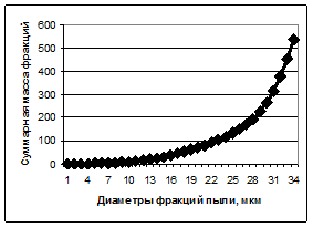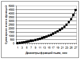 Точки на кривых графиков М50, где суммарная масса составляет 50%, называются медианами, а соответствующие им диаметры – медианными диаметрами d50, т.е. средними для данной пыли. Так для пыли, полученной при шлифовании, d50=39, 2 мкм; для пыли, полученной при пилении и фрезеровании, d50 = 69, 8 мкм. Таким образом, шлифовальную пыль следует отнести к среднедисперсной пыли, d = 10…40 мкм. Она содержит особо опасные для здоровья людей частицы размером до 10 мкм в количестве до 0, 43%. Пыль, образующуюся при пилении и фрезеровании следует отнести к крупнодисперсной, d = 40…140 мкм.