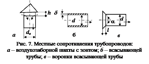При прохождении воздушного потока через переходные патрубки, диффузоры, конфузоры, коллектор, диафрагмы, переключатели потоков, задвижки, тройники барабанных питателей и другие сопротивления трубы (рис. 7) воздух преодолевает местные сопротивления. Воздушный поток в местных сопротивлениях теряет скорость. Потери давления в них называются местными потерями.