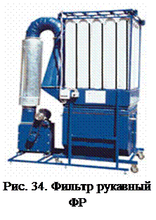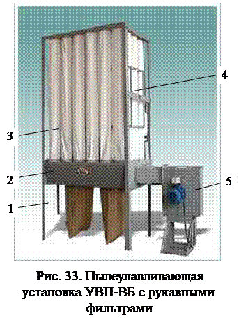 Для обеспыливания воздуха в рабочей зоне шлифовальных станков ОАО " КОНСАР" выпускает аспирационные рециркуляционные установки типа УВП-ВБ. Установка УВП-ВБ может использоваться одновременно для обслуживания одного или нескольких станков, где суммарный объем отсасываемого воздуха не превышает 3000-12000 м3/ч. Очистка воздуха происходит рукавными фильтрами (рис. 33). Степень очистки достигает 99%.