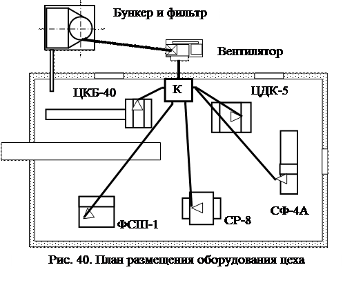 Дано. В деревообрабатывающем цехе установлены станки торцовочный ЦКБ- 40, прирезной ЦДК-5, фуговальный СФ-4А, рейсмусовый СР-8 и фрезерный шипорезный с кареткой ФСШ-1. Выполнить расчет кустовой рециркуляционной аспирационной системы с рукавным фильтром. Исходные данные. План размещения оборудования показан на рис. 40, схема поперечного сечения цеха приведена на рис. 41.