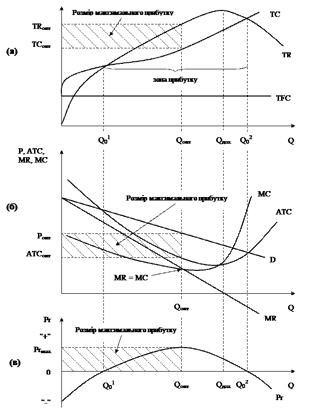 Закон і наслідок з нього можуть бути проілюстровані графічно (рис. 1.5). На верхньому графіку необхідно знайти таку точку на вісі обсягу виробництва, якій відповідала б найбільша відстань між графіками валових витрат і виручки (рис. 1.5-а). Цій же точці відповідає перетин графіку граничної виручки і графіку граничних витрат (рис. 1.5-б).