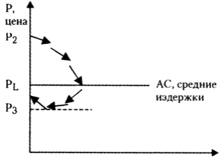 Оскільки витрати домінуючої фірми нижче ціни обмеження, вона буде отримувати економічний прибуток у довгостроковому періоді також. Якщо ж це не так, домінуюча фірма втрачає конкурентні переваги та ринкову владу і втрачає статус домінуючої фірми. Розглянемо випадок, коли потенційні конкуренти проінформовані про зміну прибутку по мірі входження нових фірм у галузь – для них не характерна короткозора стратегія. Нехай домінуюча фірма встановлює високу ціну Р2 > АС (рис. 3.7). Певна кількість нових фірм входить у галузь. Ціна знижується до рівня Рл = АС. Фірми, котрих така ціна влаштовує продовжують входити на ринок, домінуюча фірма знижує ціну до рівня Р3 < АС. Вважатимемо, що вона володіє достатньою перевагою у витратах для такого кроку.