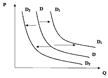 Існує принципова різниця між зміною величини попиту (обсягу попиту) і зміною попиту (попиту в цілому). Якщо при зменшенні ціни від Попит на товар визначається всією кривою попиту (D). У процесі розвитку економічного життя попит на різні товари постійно змінюється. Якщо на попит впливають нецінові фактори, то відбувається зміна попиту в цілому, тобто попит на певний товар змінюється (збільшується чи зменшується) при кожному значенні ціни (